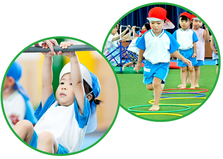 鉄棒、マット、とび箱などの器具を使った運動や、ボール遊びやエアーバルーン・・・、さまざまな運動遊びを体験し、身体を動かす楽しさを味わいながら、体力や運動能力を高めます。(3〜5歳)