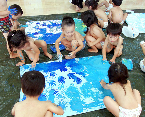 手に絵の具をつけて、ダイナミックに色をぬってみよう!