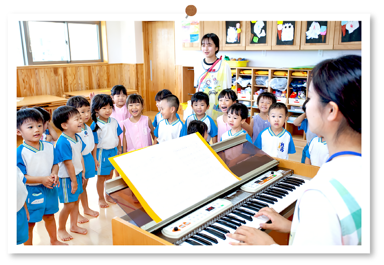 歌を歌ったり、音楽に合わせて体を動かしたり、楽器を使って演奏したり・・・日常的に音楽に親しむことで、音楽が大好きな豊かな心を育てます。